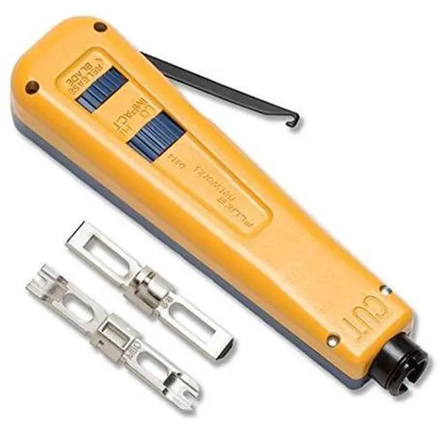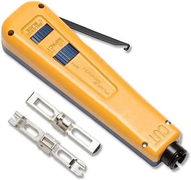 The D914 series punch down tool provides quality terminations on the first punch, helping to achieve the highest quality possible on network installations. Its the only impact tool that combines torque and impact in one tool. It also includes a built-in hook and spudger into the handle. Use the hook to remove wires from any style block or to help trace wires. Use the spudger to remove the cross-connect module from the mounting bracket. Quick and easy blade replacement, and extra blade storage available in the handle.