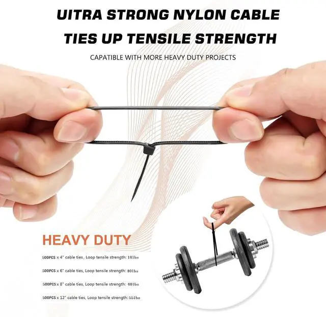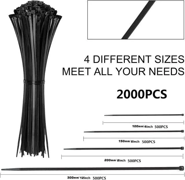 Cable Zip Ties: 4inch X500pcs 6inch X 500pcs 8inch X 500pcs 12inch X 500pcs.? Cable Ties Tensile Strength4inch-18lbs 6inch-40lbs 8inch-40lbs 12inch-50lbs. Multiple usesAssorted size zip tie has a widely used and suitable for multi-purpose projects in different situations. There are zip ties with different tensile strengths that can meet various personal and professional needs.
