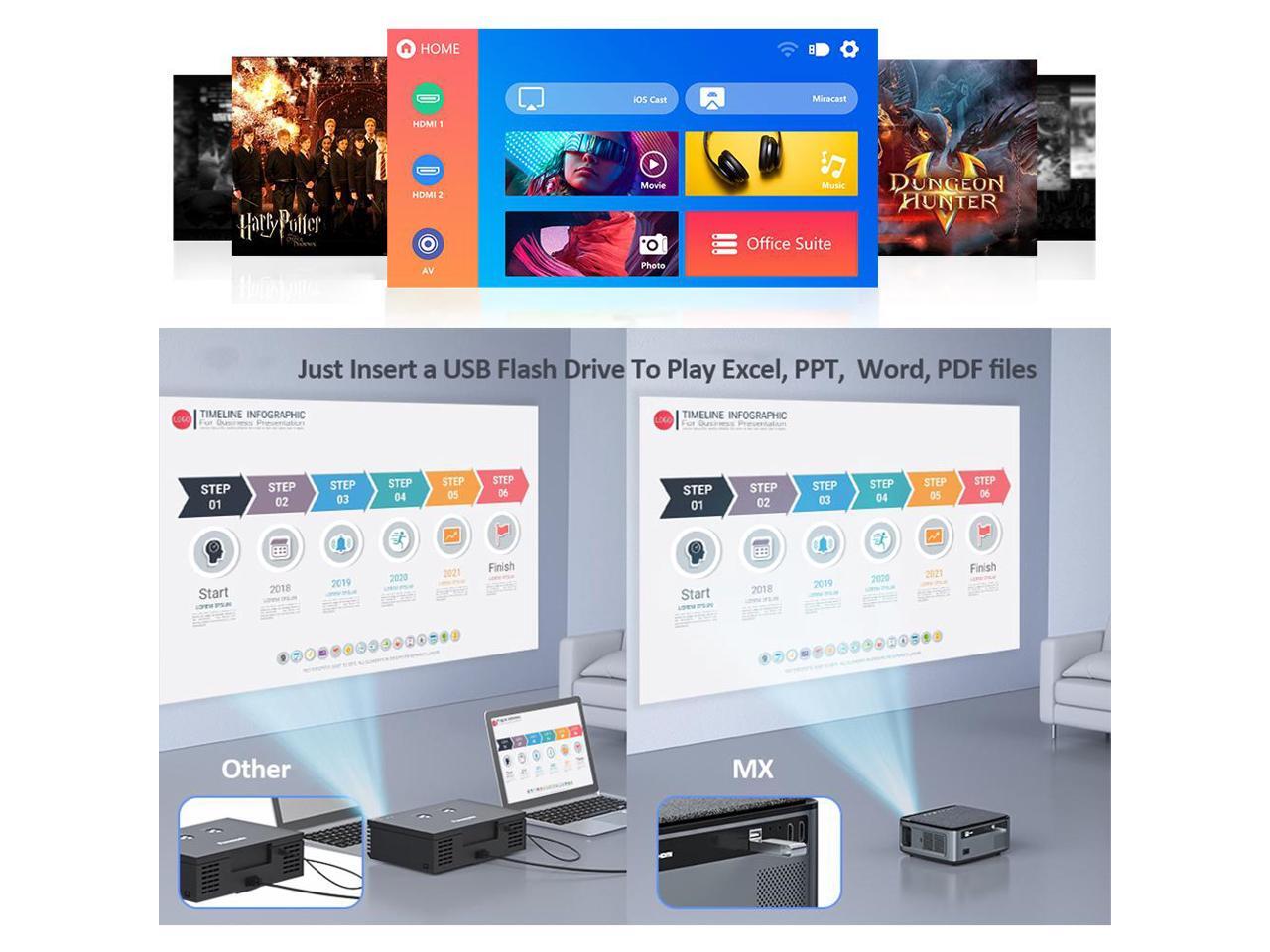 - MX WIFI projector offers a display 50" - 300 ". Besides, you can customize your projection screen size from 60% to 100% by Digital Zoom Function.