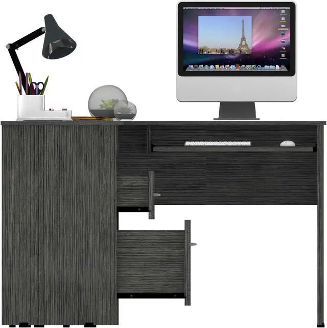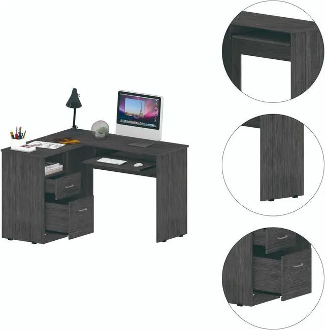 This L-shaped office desk features ample storage and storage of accessories, a hefty load capacity, and a thick panel that makes the desk sturdy. It has easy access for your legs to store all your files, documents, laptop, consoles. Plus, underneath the desk, you will find plenty of space to keep your legs relaxed and place your CPU or other supplies. Its two drawers allow storage of lots of files, books, and more. It has an open shelf to keep the CPU protected, and most importantly, thinking about facilitating the use of the desk, it has a sliding shelf for keyboards, allowing you to hide your keyboard without taking up space on the main surface.