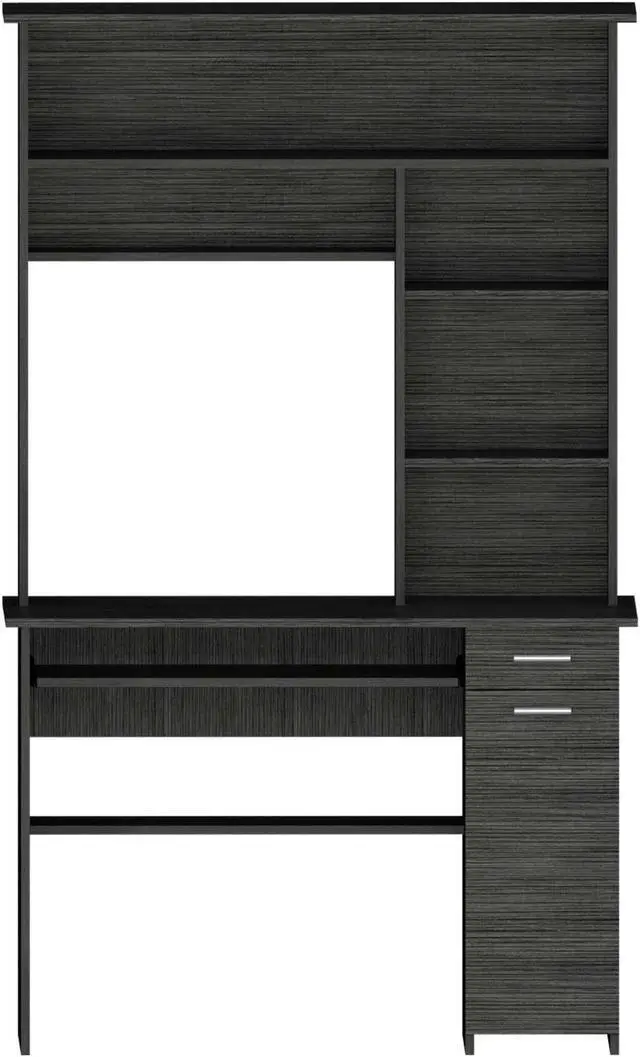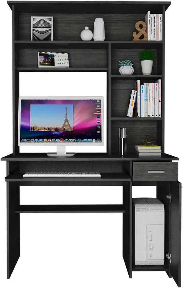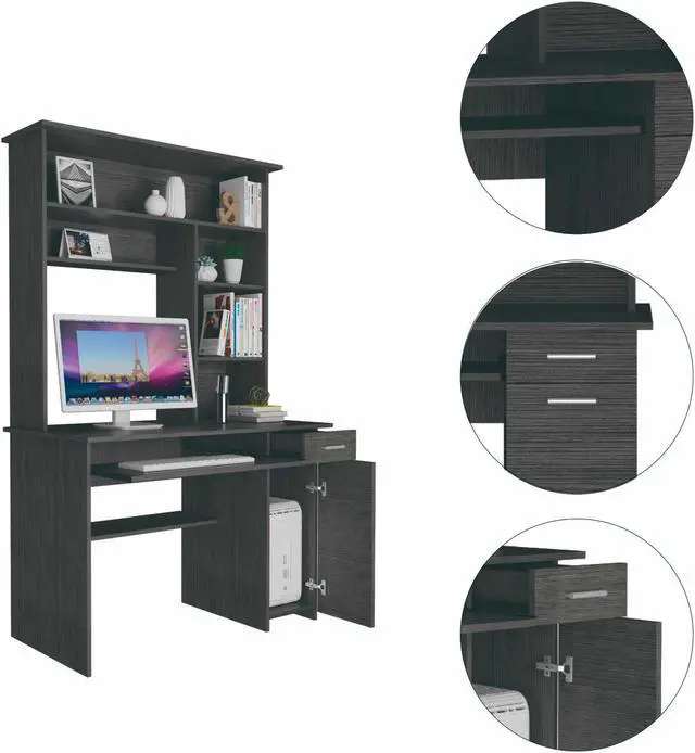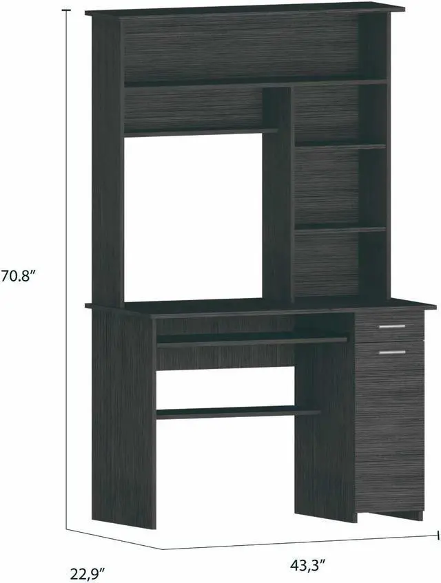 as: This desk has 25.5" in the height of legroom for your comfort. A pull-out keyboard tray will help you maximize the top surface space. A bottom shelf provides extra display or storage space. The top surface dimensions are 22.9" D x 43.3" W, spacious to fit a monitor screen, write or use your laptop comfortably. The hutch features five spacious shelves where you can put your documents, books, or decoration. A small drawer will provide concealed storage space. A 23.6" H cabinet was designed as a special place to put your PC tower while providing enough ventilation (no backdrop). It is made of particleboard with a Gray oak finish. Product dimensions are 43.3" W x 22.9" D x 70.8" H.