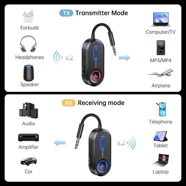 2-in-1 Bluetooth Audio Transmitter & Receiver with Built-in Mic for Hands-Free Calls - This versatile Bluetooth adapter supports both TX (transmitter) and RX (receiver) modes with one-button easy switching. In RX mode, the integrated microphone allows clear hands-free calling, so you can answer calls safely without picking up your phone. It wirelessly streams audio from non-Bluetooth devices to Bluetooth headphones/speakers, or upgrades wired stereos to wireless. Ideal for airplanes, car audio, TVs, and home entertainment systems.