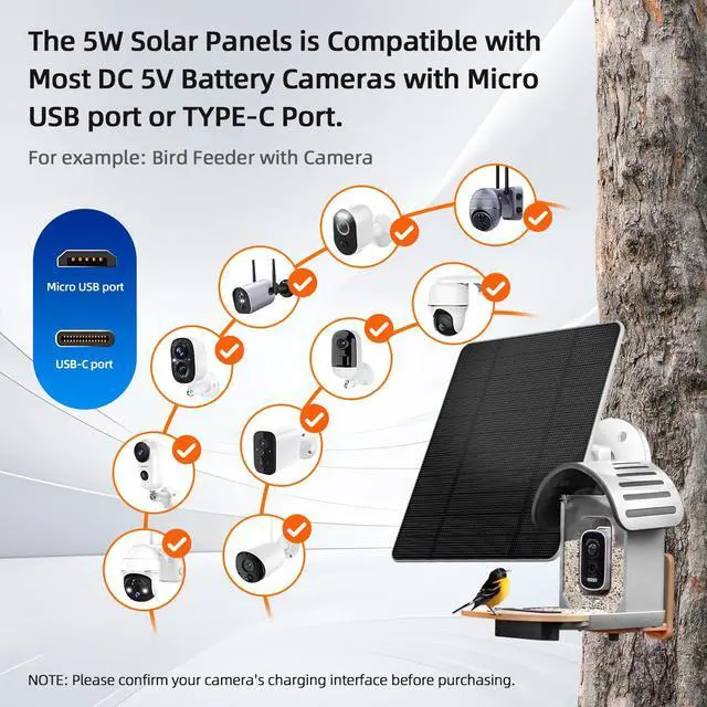 Solar Panels CompatibilityThe 5W solar panel is designed for rechargeable battery security cameras with micro USB or USB-C port. The solar panel is not compatible with Arlo, Blink, Ring, Eufy, Google Nest, Kasa cameras and any plug-in camera without battery.