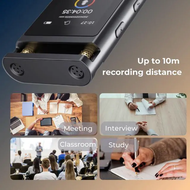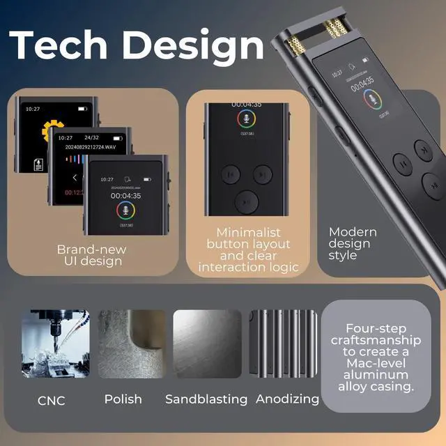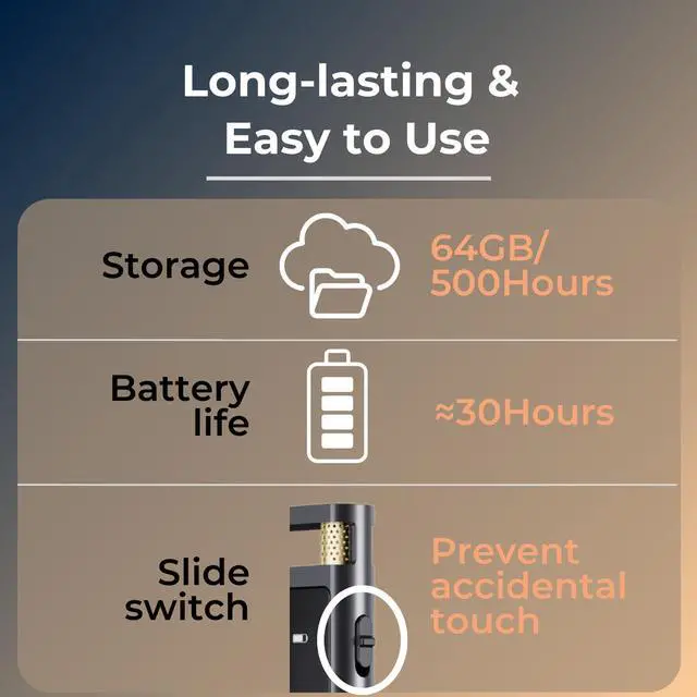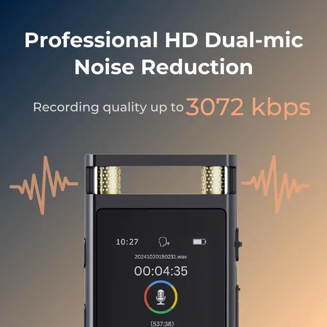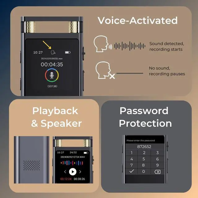 This digital voice recorder is designed to deliver exceptional performance and user convenience. Equipped with dual microphones and a recording bitrate of up to 3072kbps, it ensures clear and detailed audio recordings. The voice-activated recording feature helps save storage space, while the built-in playback function allows you to instantly listen to your recordings without the need for a PC or phone. With up to 30 hours of continuous recording and 64GB of storage capable of holding up to 500 hours of audio, this device is perfect for extended sessions. Its slide-to-record switch prevents accidental touches, and the startup password protection ensures your recordings remain secure. Crafted with a durable aluminum alloy body, a vibrant color display, and a sleek, minimalist design, this recorder combines modern style with reliability. Plus, with a 3-year warranty, you can enjoy peace of mind knowing your device is built to last.