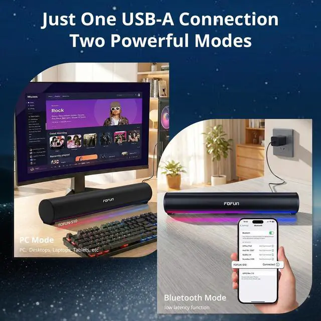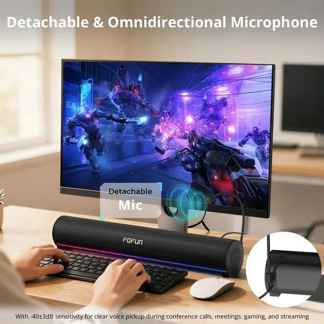 All-in-one soundbar fits neatly under monitors or laptops, reducing cable clutter.