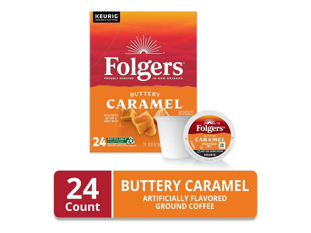 - Start each day off right with these Folgers Buttery Caramel Keurig Single Serve K-Cup Pods. Pre-portioned pods are filled with buttery caramel for a delicious, indulgent brew.