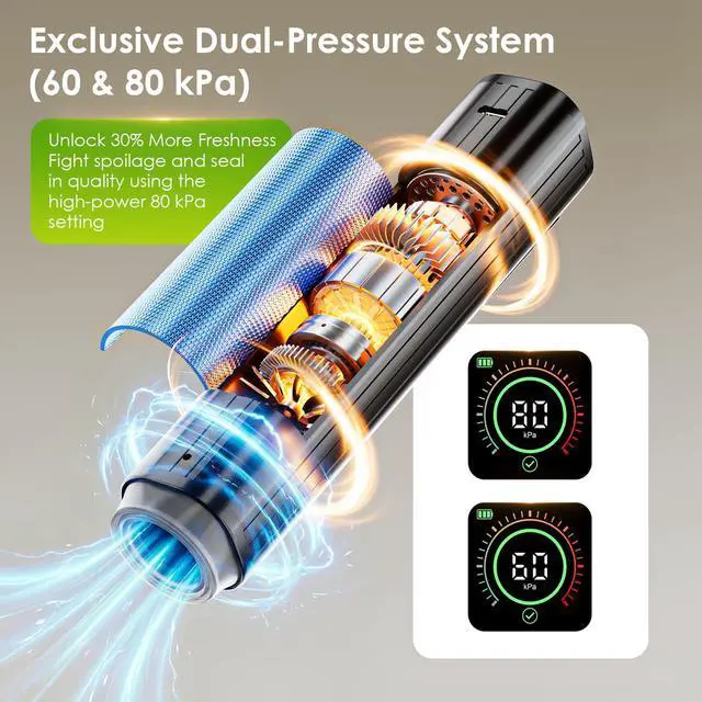 5X Longer Freshness with Smart Pressure Control Elxis's exclusive LED pressure display guides you to choose between 60kPa (delicate foods) and 80kPa (meats) - no guessing needed to optimize freshness.