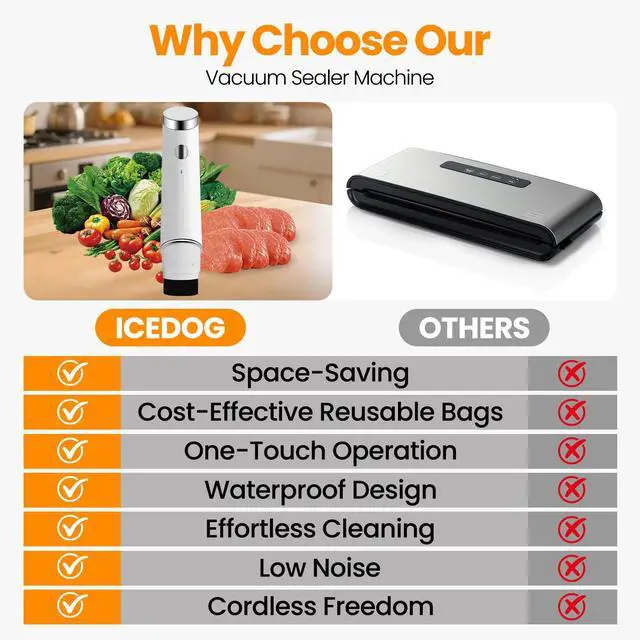 Reduce Waste & Keep Food Fresh LongerReduce Waste & Simplify Meal Prep: The ICEDOG portable vacuum sealer keeps food fresh up to 6X longer than ordinary storage by removing air and locking in flavor. Perfect for sealing meat, fish, vegetables, fruits, dry goods, pizza, cooked meals, and leftovers, helping reduce food waste and save money.