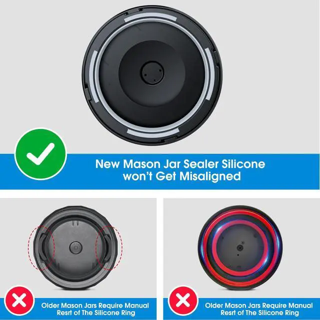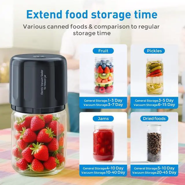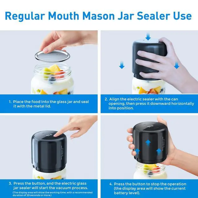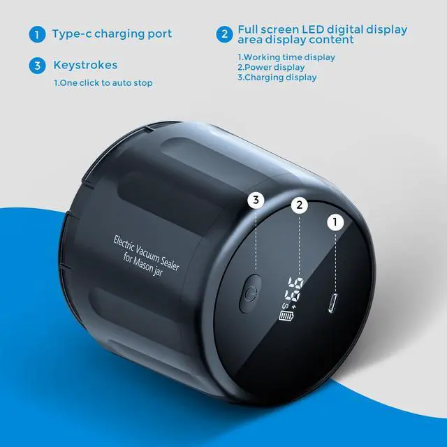 SMART AUTO STOP & LED BATTERY DISPLAYEasy ONE-TOUCH Operation with upgraded AUTO STOP Function prevents over-sealing and ensures a perfect vacuum every time. Just press one button and wait 3060 seconds to vacuum seal jars. The large LED screen clearly shows sealing progress and remaining battery, making it easier to seal jars without guesswork.