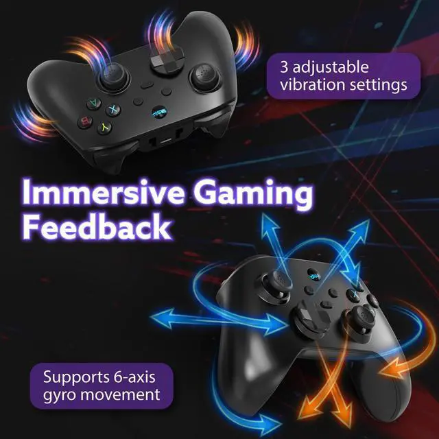 [3-Level Vibration & 6-Axis Gyro] The Fosmon wireless controller has a 6-axis gyroscope that detects your movements accurately. It also has a vibration feature that is adjustable to 3 levels: None, Weak and Strong. This makes the game more realistic and immersive. (No NFC)