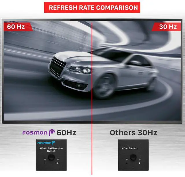 Latest HDMI 2.0 StandardWhy HDMI 2.0 for 4K? Nowadays, most high frame rate movies and games are running at 60Hz. With Fosmon's 2-Port HDMI switch with HDMI 2.0, you can enjoy full 4K 3D and 60Hz frame rates.