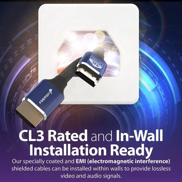 Our 4K HDMI 2.0 cables are Premium Certified, CL3 rated and in-wall ready. It has been tested and certified to transmit video and audio over the full 18 Gbps bandwidth and pass an EMI (electromagnetic interference) noise test. (Disclaimer: HDMI Licensing, LLC, 2018) Fosmon’s HDMI cables are constructed with flexible cotton mesh cable, heavy duty 24K gold-plated corrosion resistant connectors, high quality tinned copper conductors, triple cable shielding with tinplate and high-density aluminum shielding to minimize signal loss and interference. Our HDMI cables are built with the intentions of quality and performance.