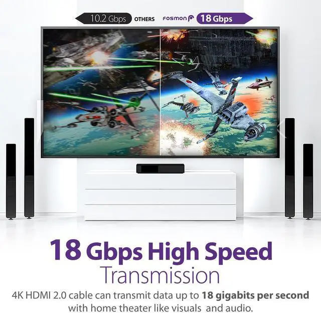 Fosmon’s 4K HDMI 2.0 cable supports up to 18 Gbps high speed data transfer, Ultra HD 4K 2160p, 2K QHD 1440p, Full HD 1080p, HDCP 2.2, 48-bit deep color, 3D, Ethernet, Audio Return Channel (ARC) and Dolby TrueHD 7.1 audio. Experience the peak performance and speeds with our HDMI 2.0 cables.