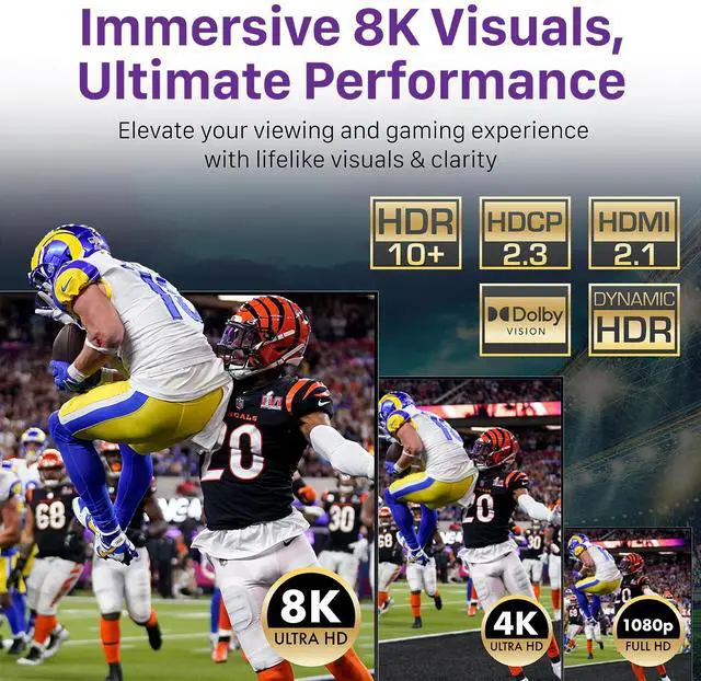 Ultra-Fast and Stable Data TransmissionOur 8K HDMI switch 2x1 delivers breathtaking visuals. Supports 8K@60Hz, 4K@120Hz, 1080P@240Hz with a 48Gbps transfer rate for a sharper, more realistic picture and enhanced gaming experience. Backwards compatible with all previous HDMI standards. Maximize your experience with seamless compatibility and enjoy the pinnacle of video and audio luxury.