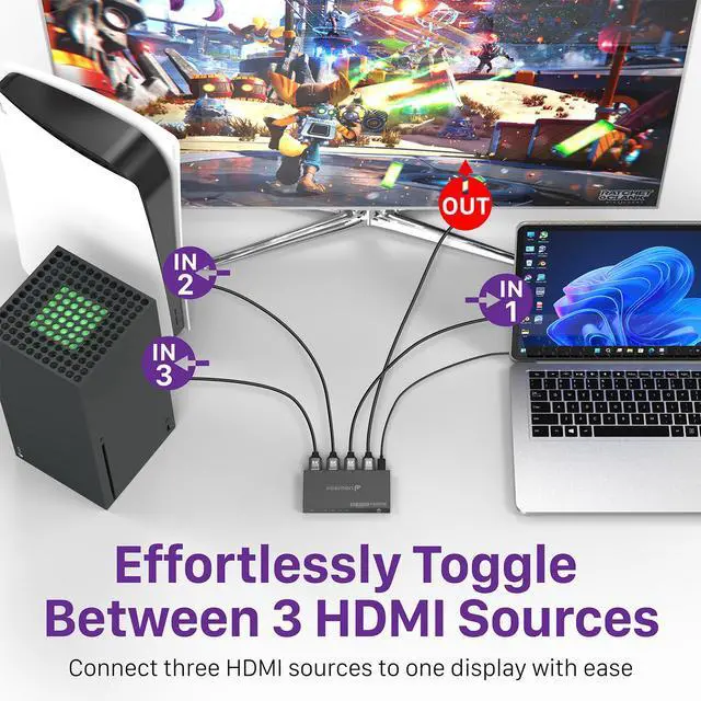 Sleek & Durable Design, Board CompatibilityThis HDMI switcher works seamlessly with devices featuring HDMI 2.1 ports or lower. Inputs: computers, XBox 360, XBox One, PS5/PS4/PS3, Xbox One Series X/S, Nintendo Switch, Apple TV, Fire Stick, Roku, Blu-Ray player and so on. Outputs: FHD TVs, monitors and projectors. The premium aluminum alloy housing guarantees durability, signal stability, heat dissipation and smudge resistance.