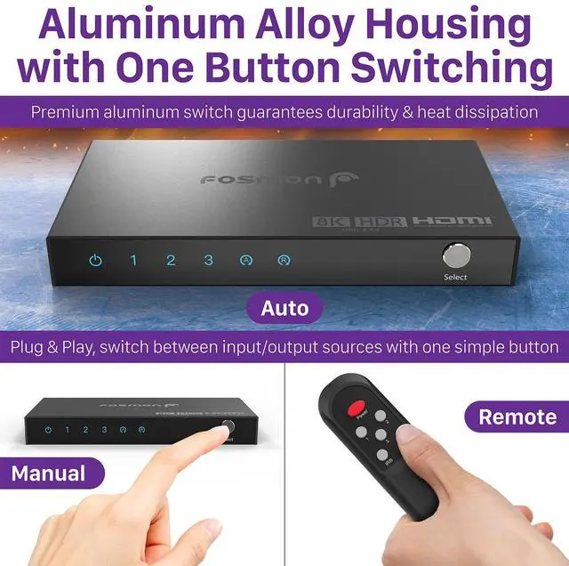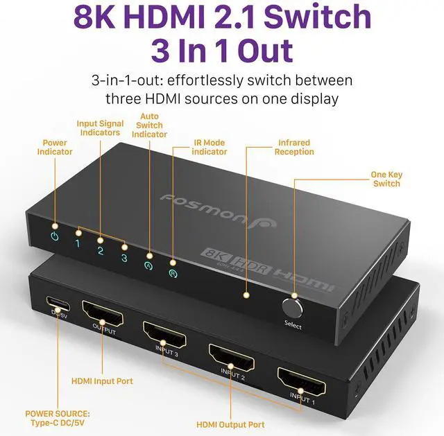 8K HDMI 2.1 Switch 3 In 1 OutIntroducing our Fosmon HDMI 8K 3 in 1 out switch. Effortlessly switch with a simple press of a button on the switcher or the IR remote and control between 3 HDMI video sources on 1 HD display, reducing cable hassle and extending gear lifespan. Experience no delays or signal loss, thanks to the 48Gbps data transmission (Note: Requires HDMI 2.1 cable for 8K@60Hz resolution.)