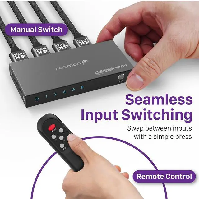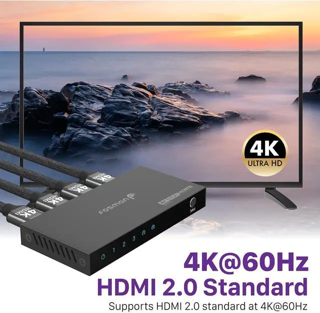 4K HDMI 2.0 Switch 3 In 1 OutIntroducing the Fosmon 4K@60Hz 3 in 1 out HDMI switch. Seamlessly transition between three HDMI sources with either the switch or the included IR remote. Streamline your setup, eliminating cable clutter, and prolong the lifespan of your equipment. Enjoy uninterrupted signal transmission and zero delays thanks to our top-notch construction. Simplify your multimedia experience with effortless source switching and superior performance.