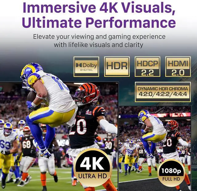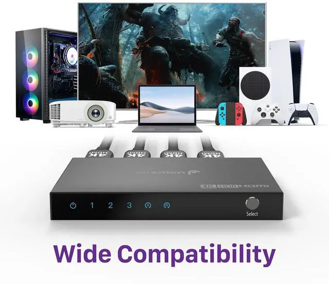 Seamless Gaming ExperienceElevate your entertainment with stunning 4K high-definition quality. Supports HDR and HDCP 2.2 to ensure seamless compatibility with various devices and latest consoles, enhancing your viewing and gaming experience with lifelike visuals and clarity. Switch between auto/manual mode switching to ensure that your current input does not accidentally switch to another input with simple press of a button.