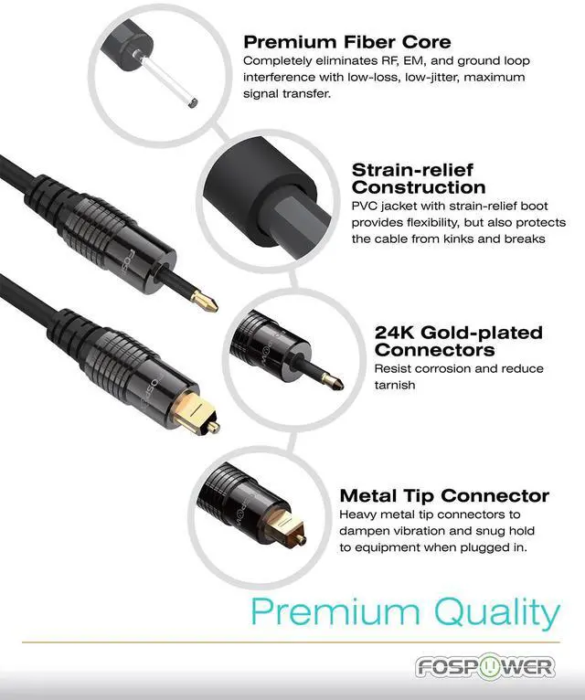 Premium Fiber Core and Metal Connectors Constructed from high quality low-loss, low-jitter, maximum signal transfer, precision polished fiber core that completely eliminates RF, EM, and ground loop interference. Coupled with heavy metal connectors to dampen vibration, FosPower Toslink cable completes your ultimate digital audio experience.