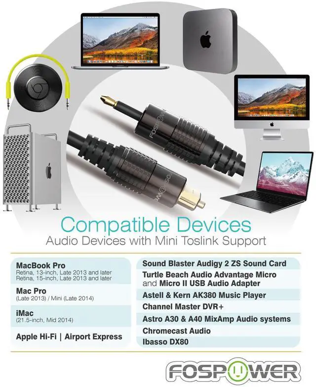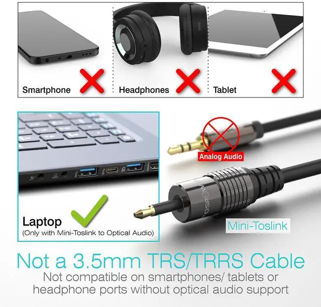 Only works with the following devices that have 3.5mm optical/Mini Toslink input or output: