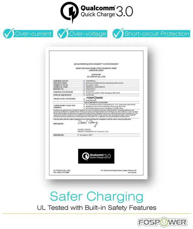 Safely Charge Your DevicesConforms with UL2089 Safety Standards. FosPower's 2-Port USB car charger comes with a triple safety feature and has built-in over-current, over-voltage, and short-circuit protection.