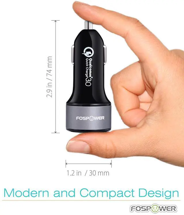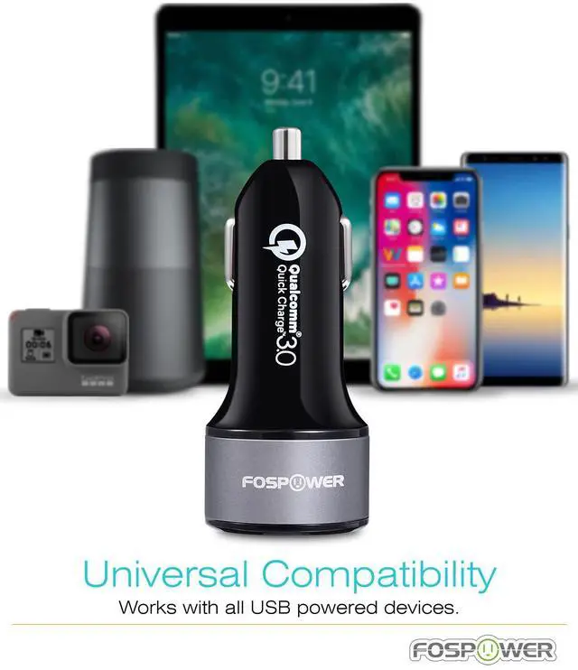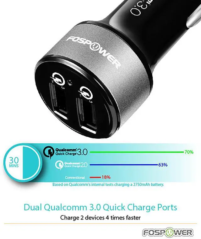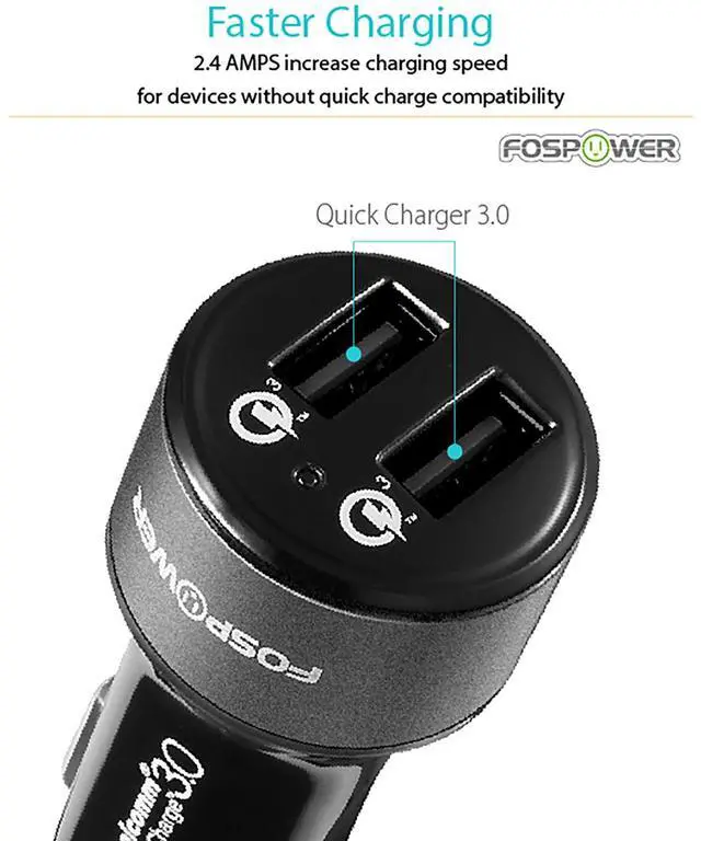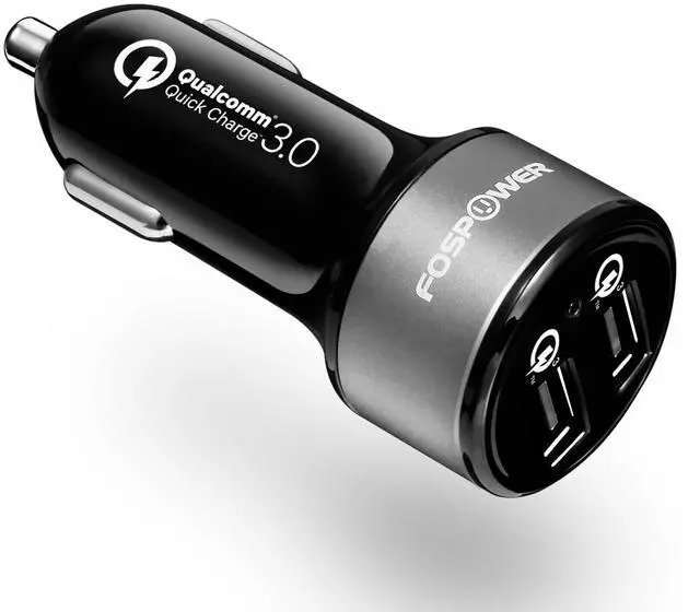 2-port USB Car Charger with Quick Charge 3.0FosPower's 2-Port USB car charger turns your car outlet into a dual Quick Charge 3.0 USB charger. With two Qualcomm Quick Charge 3.0 ports, you can charge your devices up to 80% in just 35 minutes, 4 times faster than conventional car chargers. Backward compatible with QC 1.0 and 2.0 Technology. Quick Charge up to 2 devices at once.