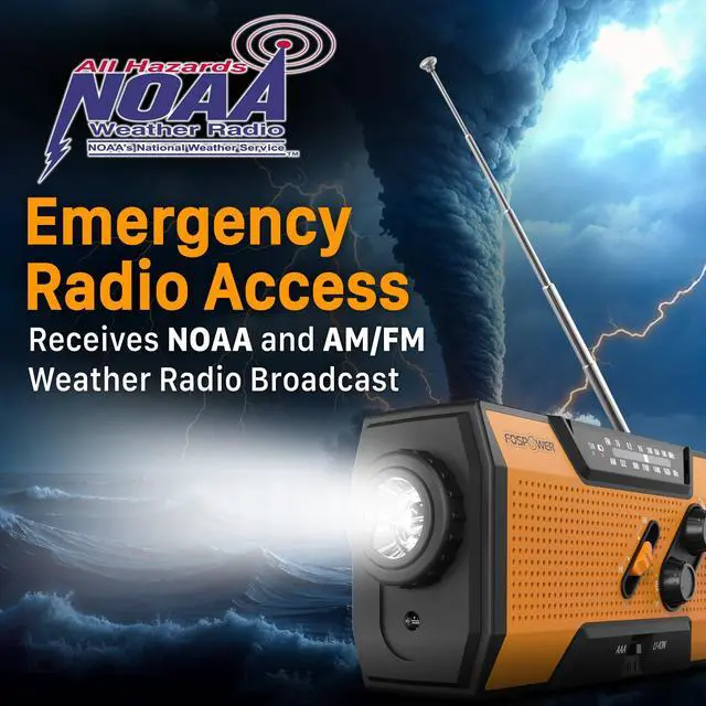 FosPower's emergency radio will give you dependable access to emergency NOAA weather broadcasts. The AM/FM function provides full access to all AM or FM radio broadcasts.