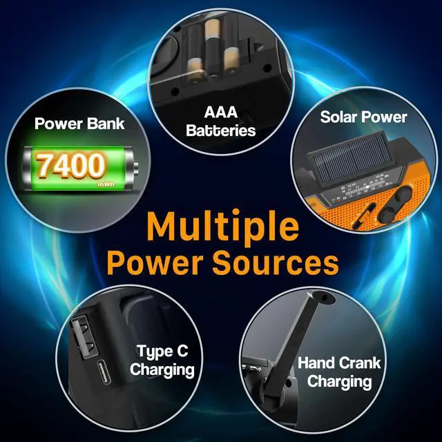 The weather radio provides you with tools to use in emergency and non-emergency environments. The radio comes integrated with a 1W LED flashlight with zoom, an SOS alarm, 7400mWh (2000mAh) power bank, 2 LED lights, radio broadcasts access, and 4 power options to provide emergency power.
