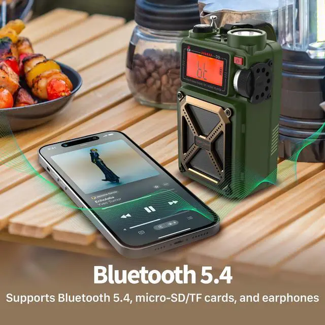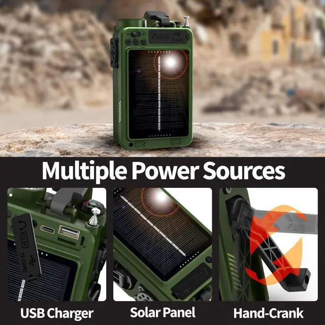 The built-in 14800mWh (4000mAh) battery is perfect for powering your radio and charging your phones, ensuring you stay connected in any situation. It offers three convenient charging options: USB-C, hand crank, and solar, making it versatile and reliable for emergencies and outdoor adventures.