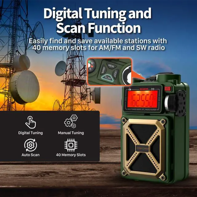 The emergency radio features AM/FM/SW/WB broadcasts to keep you informed of the latest updates. It also includes a flashlight for visibility, an SOS alarm for alerting others, and a built-in compass for navigation, making it an essential tool for any emergency kit.