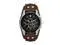 Building off a classic design, a thick rich leather cuff adds rugged appeal to this sharp steel chronograph.