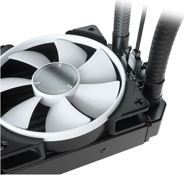 Braided tube sleeves contain the fan control cables and ARGB wires.