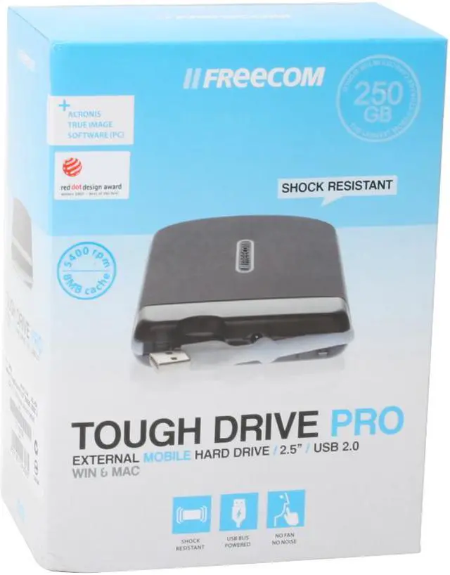 What's the point of having a portable external hard drive if you have to worry about it all the time? Freecom said that's not the way to live and introduced the ToughDrive. This massive 250GB drive has the capacity to store all your important files with room to spare for your music collection, and it's designed to work in the real world.