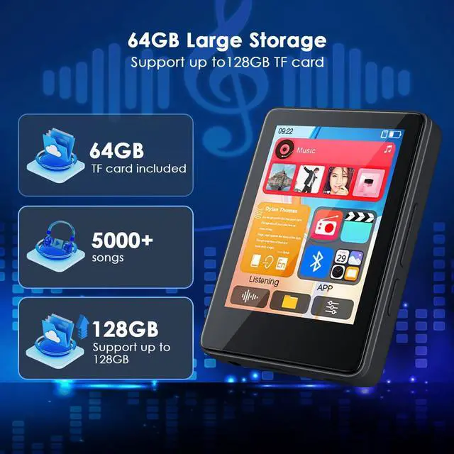 This mp3 music player comes with a 64GB tf card.Supports up to 128GB of memory cards, which can store thousands of music files of your true love.