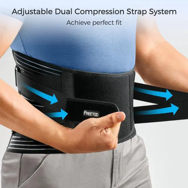 • Relieve LOWER BACK PAIN Freetoo Back brace contains 4 Memory-aluminum stays that are quadruple harder than the commonly used PP stripsand 2 steel springs placed along the waist side, offer 360° stronger vertical support to the lower back, prevent excessive rolling of your muscles and decrease the pressure on your discs.