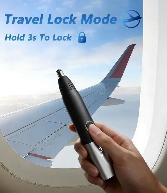 This mens nose and ear trimmer features a travel lock function. Press and hold for 3 seconds to turn it on or off.