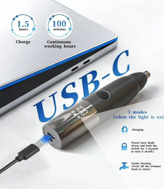 This nose hair trimmer for men rechargeable supports USB-C charging,allowing you to charge it via your computer or a power bank.
