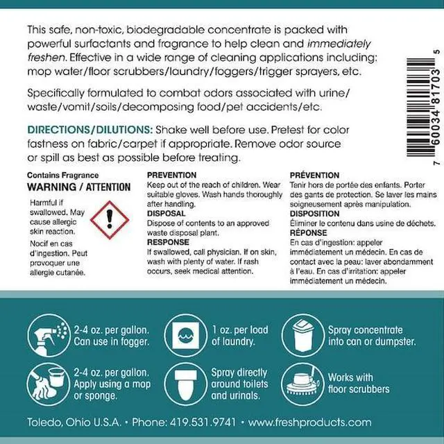 This water-soluble formula cleans, deodorizes and refreshes surfaces. The formula contains powerful detergents and potent perfumes to counteract malodors and leave the area smelling fresh and clean. Add 1-2 oz. per gallon of water or cleaning solution. Use in fabric shampoo, mop water, any water-based solution. Can be used in trigger sprayers, carpet extractors and laundry.