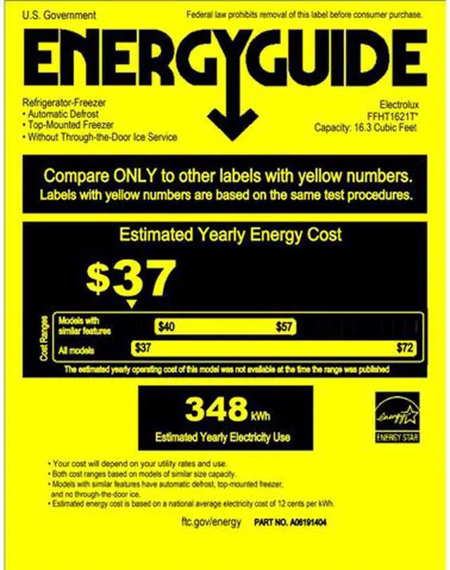 | Specifications | General Specifications: Condenser Type: Dynamic Prop 65 Label: No Refrigerant Type: R-134 Controls: Digital Display: No Freezer: Automatic Defrost: Yes Shelf Material: Wire Number of Fixed Shelves: 1 Ice Maker: Ice Maker: No Ice Maker Ready: Yes Exterior: Cabinet Finish: Textured Door Stops: Yes Front Rollers: Yes Rear Rollers: Yes Refrigerator: Crisper Color: Clear Dairy Bin: Yes Door Bin Color: White Humidity Controls: Automatic Interior Lighting: Incandescent Shelf Material: Glass Number of Adjustable Gallon Door Bins: 1 Number of Fixed Gallon Door Bins: 3 Number of Pull Out Shelves: 2 Number of Crispers: 2 Certifications and Approvals: ADA Compliant: Yes CSA Listed: Yes UL Listed: Yes ETL Listed: No NSF Certified: No ENERGY STAR Certified: Yes |