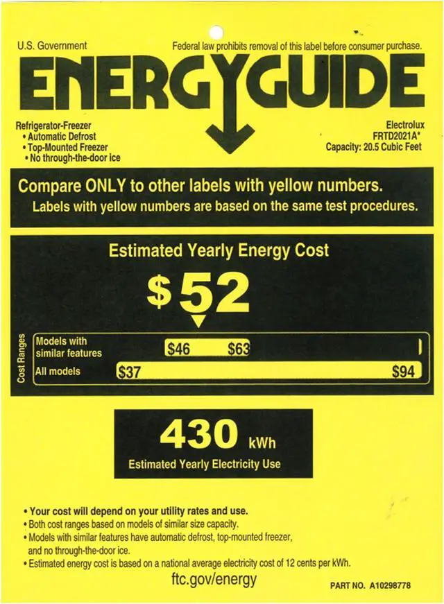 | Specifications | Height With Hinge: 69" Height Without Hinge: 68 1/4" Width: 30" Width of Cabinet: 29 5/8" Depth of Cabinet: 28 1/2" Depth With Door: 31 3/4" Depth With Door 90° Open: 60" Depth With Door and Handle: 34 1/8" Freezer Capacity: 5.15 Cu. Ft. Fresh Food Capacity: 15.3 Cu. Ft. Total Capacity: 20.5 Cu. Ft. Annual Energy: 430 kWh Condenser Type: Dynamic Leveling Legs: Yes Product Weight: 209 lbs Prop 65 Label: Yes Refrigerant Type: R-600A Warranty - Labor: 1 Year Warranty - Parts: 1 Year Control Location: Top Center of Fresh Food Digital Display: No Door Ajar Alarm: No Amps @ 120 Volts: 3 Amps Minimum Circuit Required: 15 Amps Automatic Defrost: Yes Door Bin Color: White Shelf Material: Wire Number of Fixed Door Bins: 2 Total Number of Door Bins: 2 Number of Adjustable Shelves: 1 Total Number of Shelves: 1 Ice Maker: No Ice Maker Ready: Yes Door Finish: Textured Door Stops: Yes Front Rollers: No Rear Rollers: Yes Air Filter: No Crisper Color: Clear Dairy Bin: Yes Door Bin Color: White Humidity Controls: Manual Interior Lighting: LED Shelf Material: Glass Water Filter: No Number of Fixed Gallon Door Bins: 1 Number of Other Door Bins: 2 Total Number of Door Bins: 3 Number of Adjustable Shelves: 2 Number of Fixed Shelves: 1 Number of Crispers: 2 |
