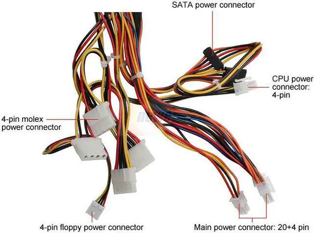 It comes with the standard connectors, power, CPU, floppy and Molex. It also has 2 SATA connections so you can add faster drives to your system. The dual +12V rails ensure a balanced output.