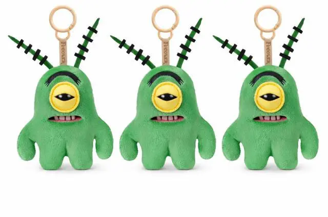 This set of 3 Fuggler SpongeBob Plankton plush keyring features the mischievous character reimagined in the quirky Fuggler style. The design blends recognizable Plankton details with the distinctive Fuggler expression and plush texture. Crafted from soft fabric, it provides a comfortable feel while keeping its shape. The attached keyring makes it easy to clip onto bags, backpacks, or key sets. This plush keyring offers a playful collectible inspired by the SpongeBob universe.