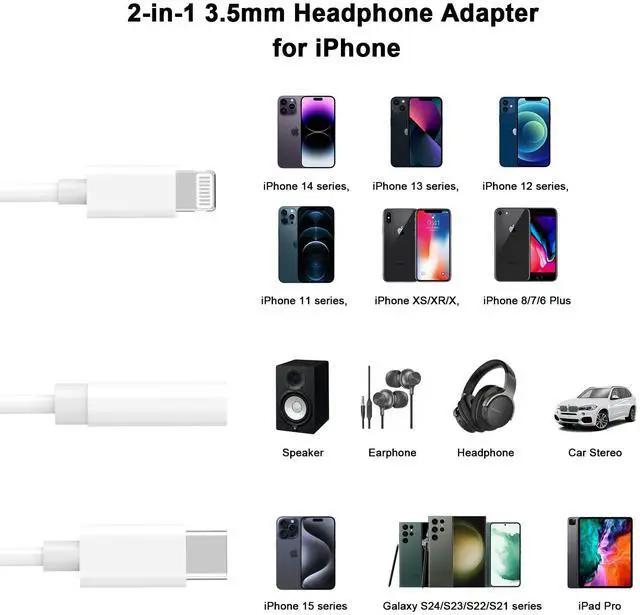 ![Main image of iPhone Headphone Adapter, [Apple MFi Certified] 2-in-1 Lightning/USB Type C to 3.5 mm Headphone Jack Adapter, iPhone Aux Adapter Converter Dongle Audio Cable for iPhone 17 16 15 14 13 12 11 XS XR X 8](https://c1.neweggimages.com/productimage/nb640/C688D2604210S53RF34.jpg)