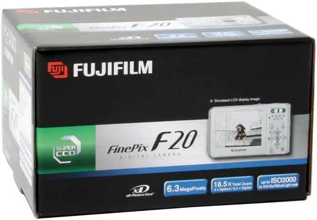 Capture the precious moments of your life with the sleek, compact, and easy-to-use, FinePix F20 Silver Digital Camera from FujiFilm. Equipped with a 6.3 MP CCD image sensor, this camera allows you to capture images in amazing detail and blazing color. The 3X optical zoom lens makes vivid close-ups effortless, and the 6.2X digital zoom lets you focus on the smallest details. Real Photo Technology, combined with ISO 100-2000 sensitivity, reduces image noise in even the lowest light. Fujifilm's new i-Flash intelligent Flash System automatically senses light levels for the ideal balance of flash output and aperture.