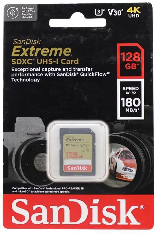 (1) Speeds vary by capacity. [256GB-512GB]: Up to 180MB/s read speed. Engineered with proprietary technology to reach speeds beyond UHS-I 104MB/s, require compatible devices capable of reaching such speeds. Write speed up to 130MB/s. Based on internal testing; performance may be lower depending on host device, interface, usage conditions and other factors. 1MB=1,000,000 bytes. [128GB]: Up to 180MB/s read speed. Engineered with proprietary technology to reach speeds beyond UHS-I 104MB/s, require compatible devices capable of reaching such speeds. Write speeds up to 90MB/s. Based on internal testing; performance may be lower depending on host device, interface, usage conditions and other factors. 1MB=1,000,000 bytes. [64GB]: Up to 170MB/s read speed. Engineered with proprietary technology to reach speeds beyond UHS-I 104MB/s, require compatible devices capable of reaching such speeds. Write speeds up to 80MB/s. Based on internal testing; performance may be lower depending on host device, interface, usage conditions and other factors. 1MB=1,000,000 bytes. [32GB]: Up to 100MB/s read speed. Write speed up to 60MB/s. Based on internal testing; performance may be lower depending upon host device. 1MB=1,000,000 bytes. (2) SANDISK QuickFlow Technology is only available for 64GB, 128GB, and 256GB capacities. Must use SANDISK Professional PRO-READER SD and microSD to achieve maximum transfer speeds (sold separately). (3) Full HD (1920x1080) and 4K UHD (3840 x 2160) video support may vary based upon host device, file attributes and other factors. See HD page on Sandisk site. (4) UHS Speed Class 3 designates a performance option designed to support 4K UHD video recording with enabled UHS host devices. UHS Video Speed Class 30 (V30), sustained video capture rate of 30MB/s, designates a performance option designed to support real-time video recording with UHS enabled host devices. See the SD Association’s official website. (5) Card only. See product packaging or see proof page on Sandisk site. (6) Registration required; Terms and conditions apply. (7) 1GB=1,000,000,000 bytes. Actual user storage less. (8) Read speed only, engineered with proprietary technology to reach speeds beyond UHS-I 104MB/s, require compatible devices capable of reaching such speeds. Based on internal testing; performance may be lower depending upon host device, interface, usage conditions and other factors. 1MB=1,000,000 bytes. (9) Write speed only. Based on internal testing; performance may be lower depending upon host device, interface, usage conditions and other factors. 1MB=1,000,000 bytes.