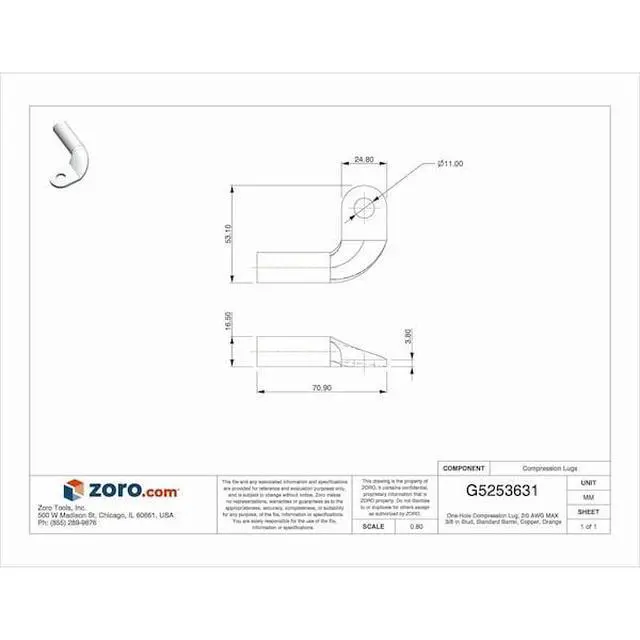 Lug Starter/Ground, Lug Type Heavy Wall Lug, Connection Type Lug, Contact Material Tin Plated Copper, Gauge 2/0 ga, Color Code Orange, Stud Size 3/8 in, Shape Elbow, Raised Pads Yes, Standards cULus, RoHS. This item has been restricted from sale in the following state (s): []