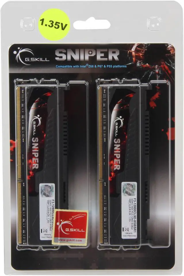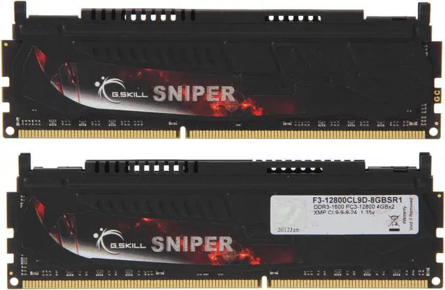 Dual-Channel DDR3 1600Reaching the optimal balance between the sheer speed of DDR3 and low latency, the G.SKILL Sniper Series F3-12800CL9D-8GBSR1 DDR3 memory kit is rated at 1600MHz 9-9-9-24 to provide ample computing capability to the Intel LGA1155/LGA1156 and AMD AM3/Llano/AM3+ platforms.
