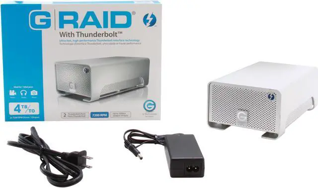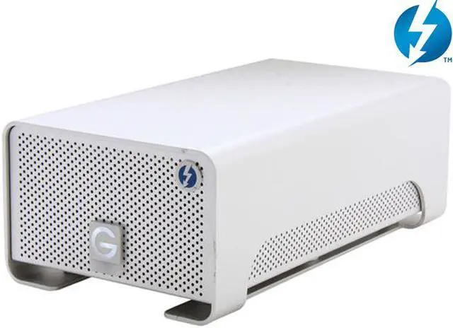 | Features | Dual Thunderbolt Ports Utilizing the fastest I/O technology to date, this G-RAID has read and write speeds of up to 10Gbps, which translates over to 800MB/s. That's twice as fast as USB 3.0 (5Gbps) and 12 times faster than FireWire 800 (800Mbps). Also, you can daisy-chain up to six Thunderbolt-compatible peripherals