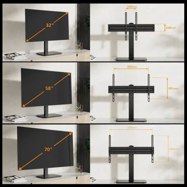 The Gabor Universal Swivel Tabletop Stand includes brackets compatible with various VESA patterns, ensuring a secure fit for your TV. Whether your TV has standard or non-standard VESA mounting holes, this stand has you covered for a stable and safe setup.