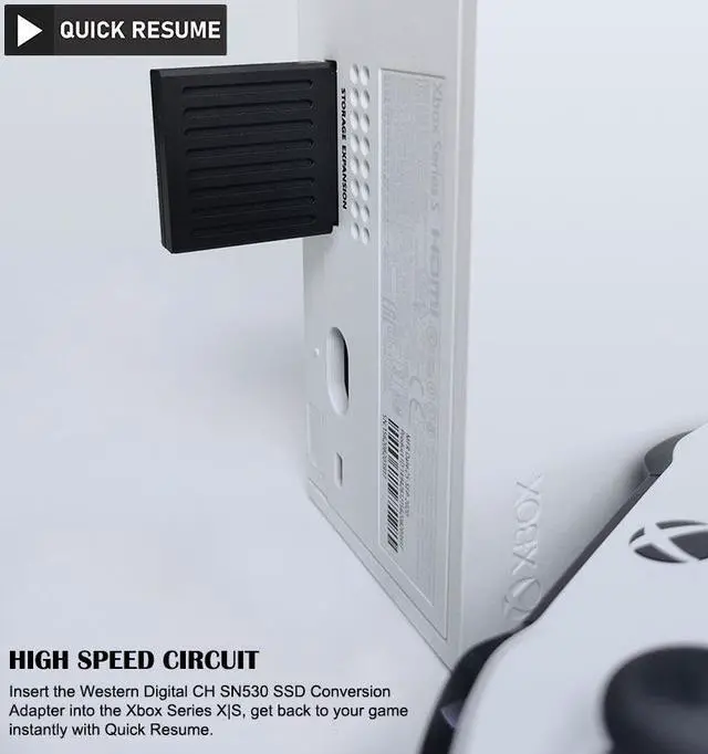 Insert the Western Digital CH SN530 SSD Conversion Adapter into the Xbox Series X|S, get back to your game instantly with Quick Resume